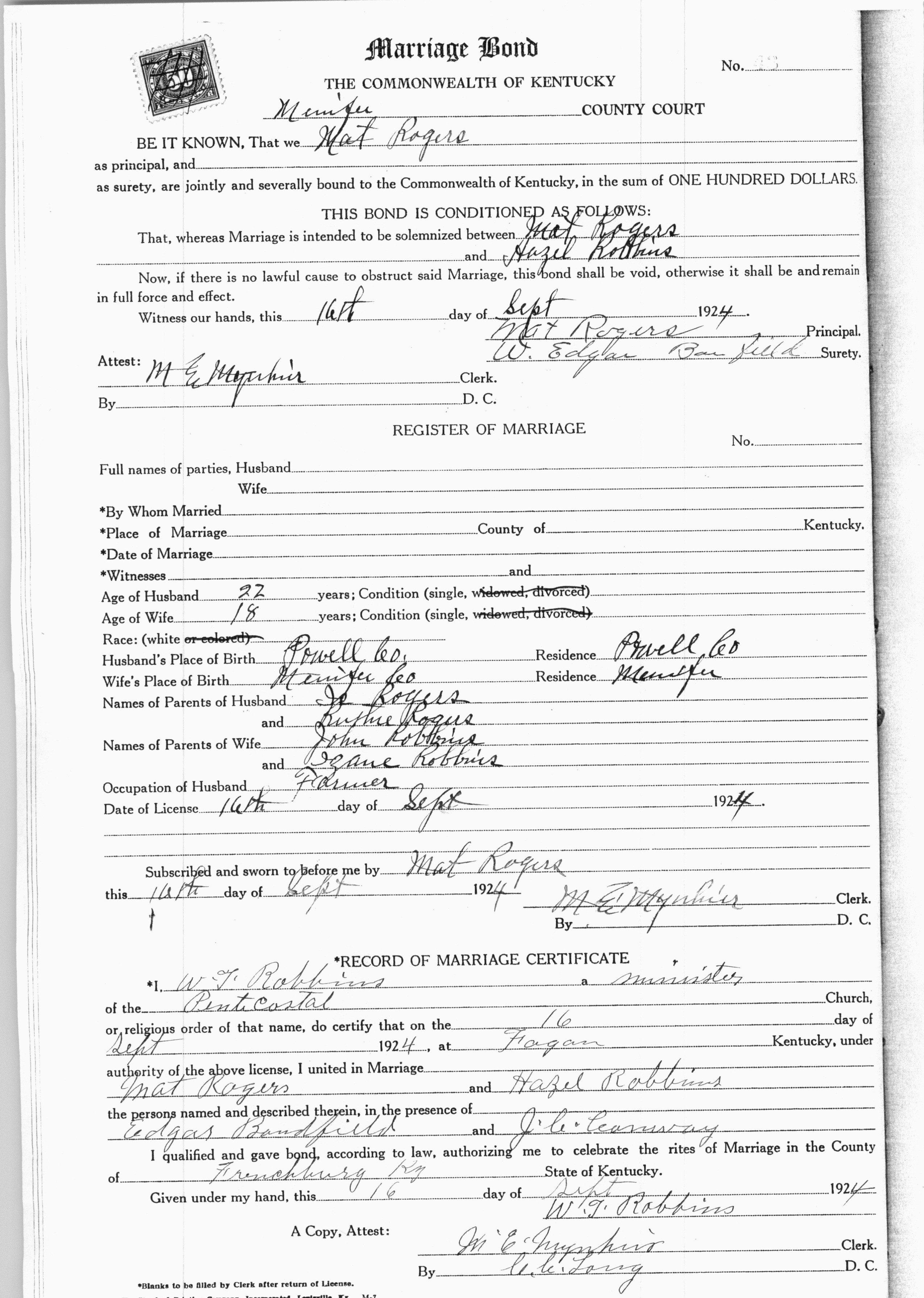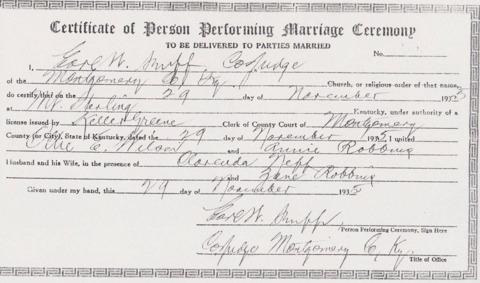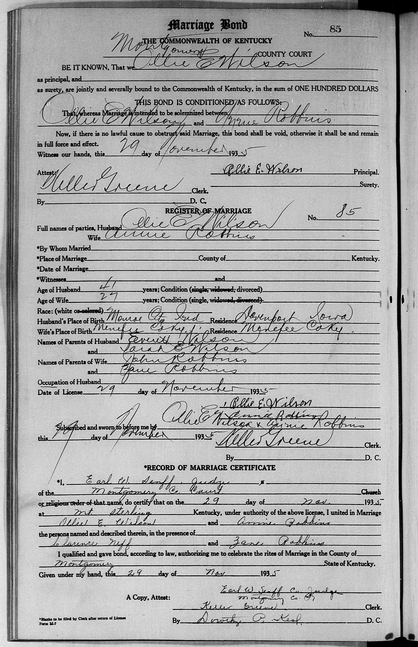 | Annie Robbins | Ollie Esko Wilson | November 29, 1935 | Montgomery County, Kentucky |