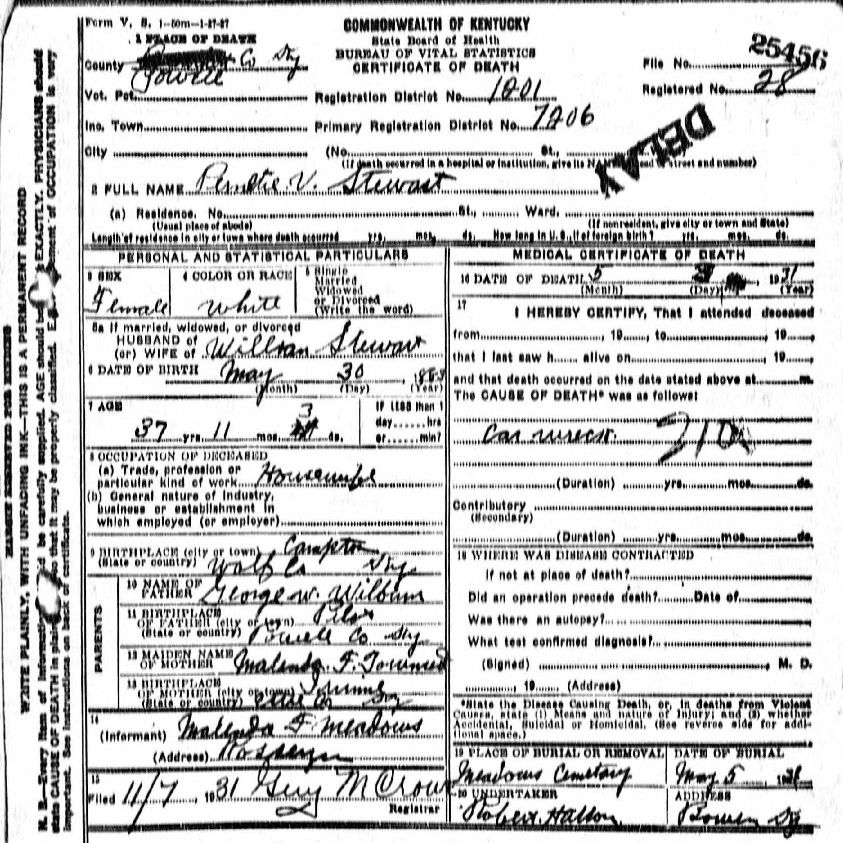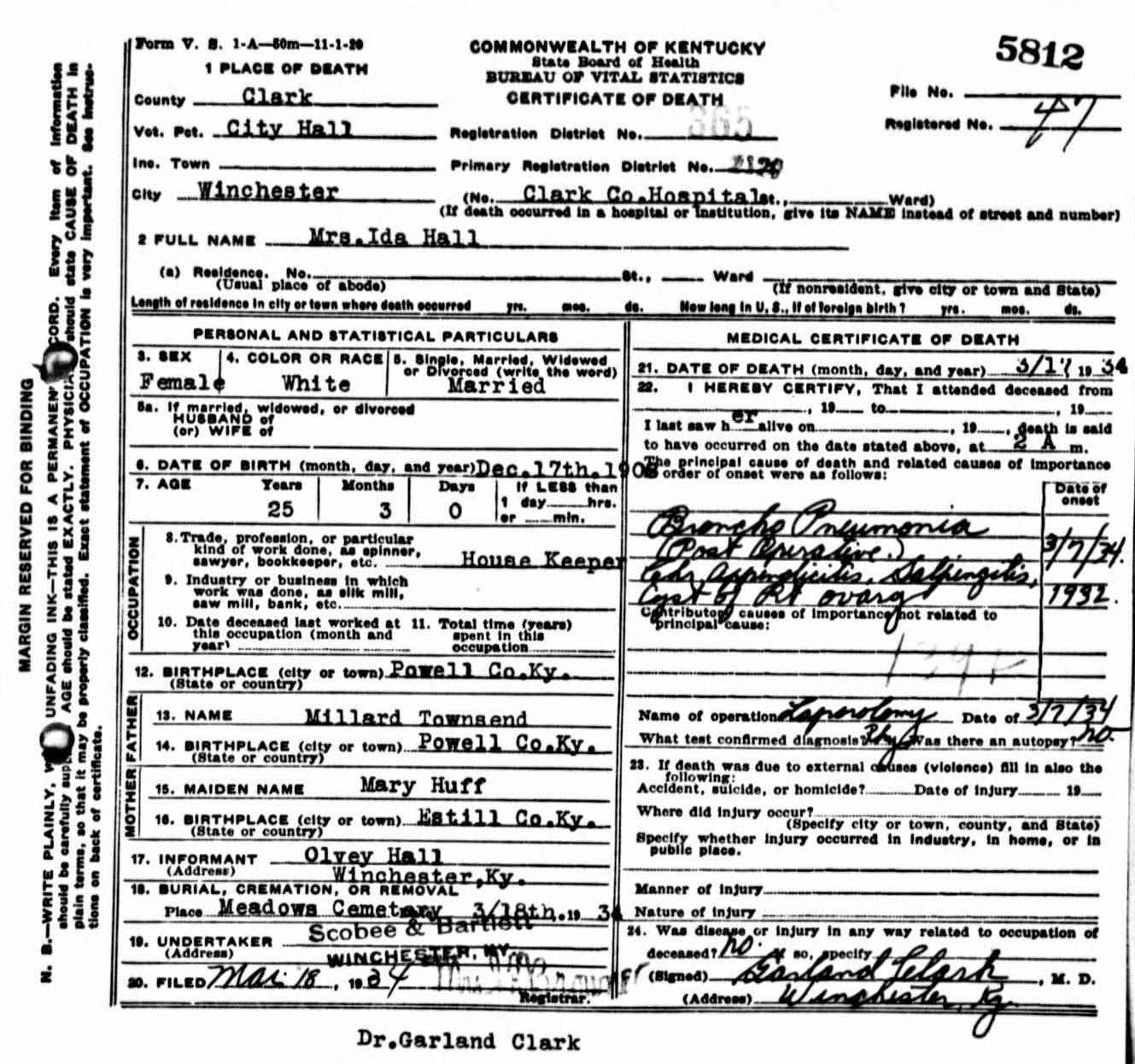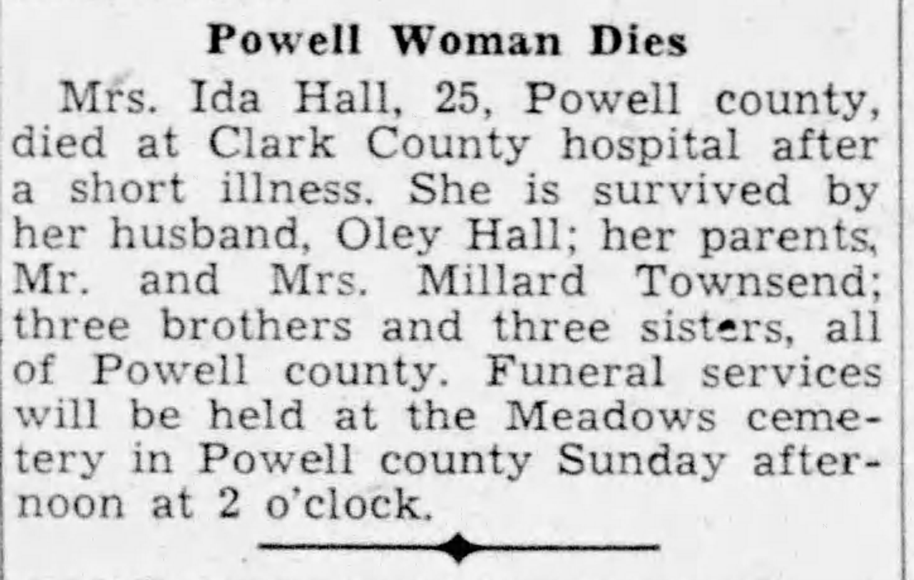 | Hall | Ida | Townsend | December 17, 1902 | March 17, 1934 | Millard Townsend & Mary Hugg | Powell County, Kentucky | Clark County, Kentucky | Lexington Herald Leader | March 18, 1934 |