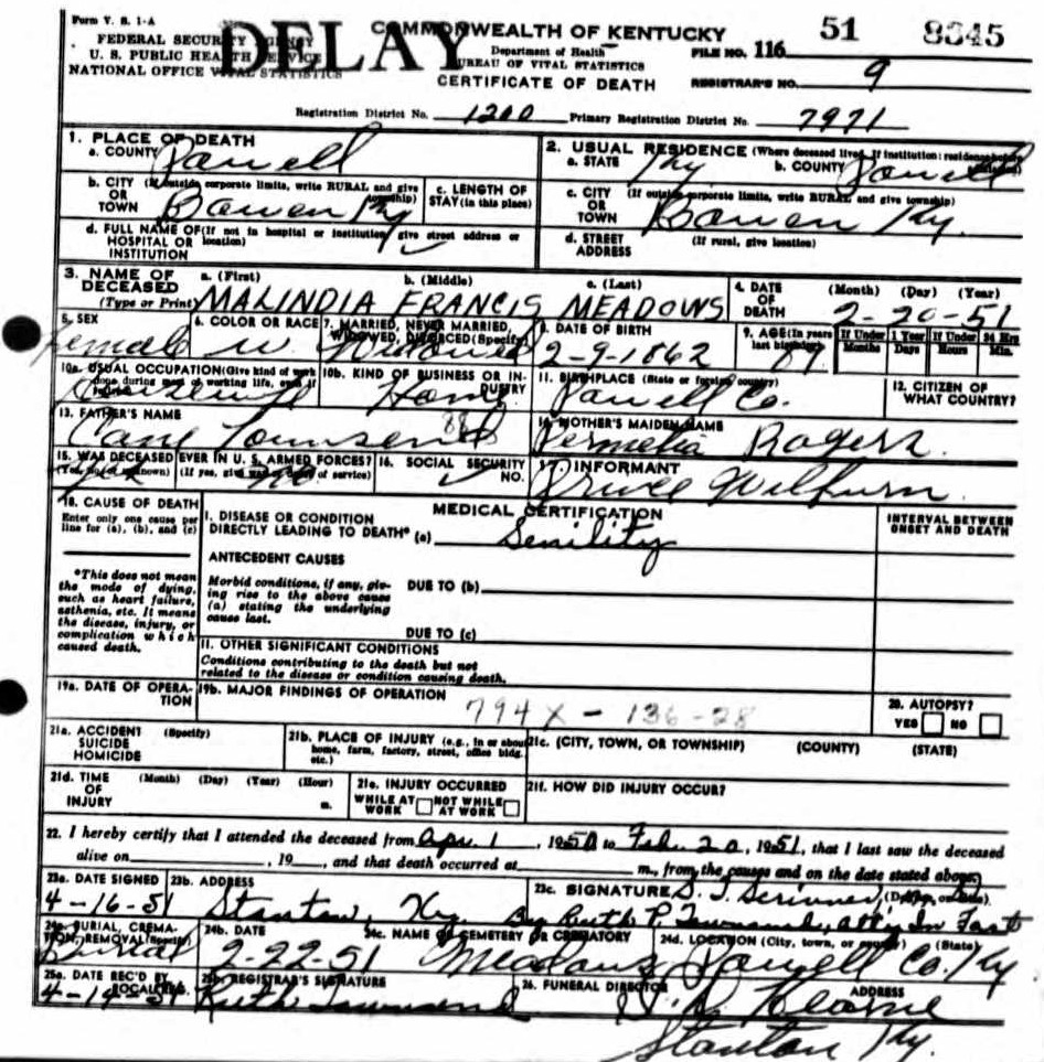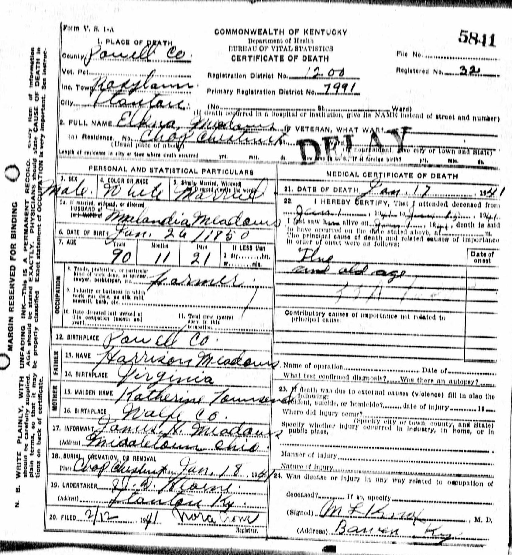 January 26, 1850 | January 17, 1941 | Harrison Meadows & Katherine Townsend | Powell County, Kentucky | Powell County, Kentucky |
