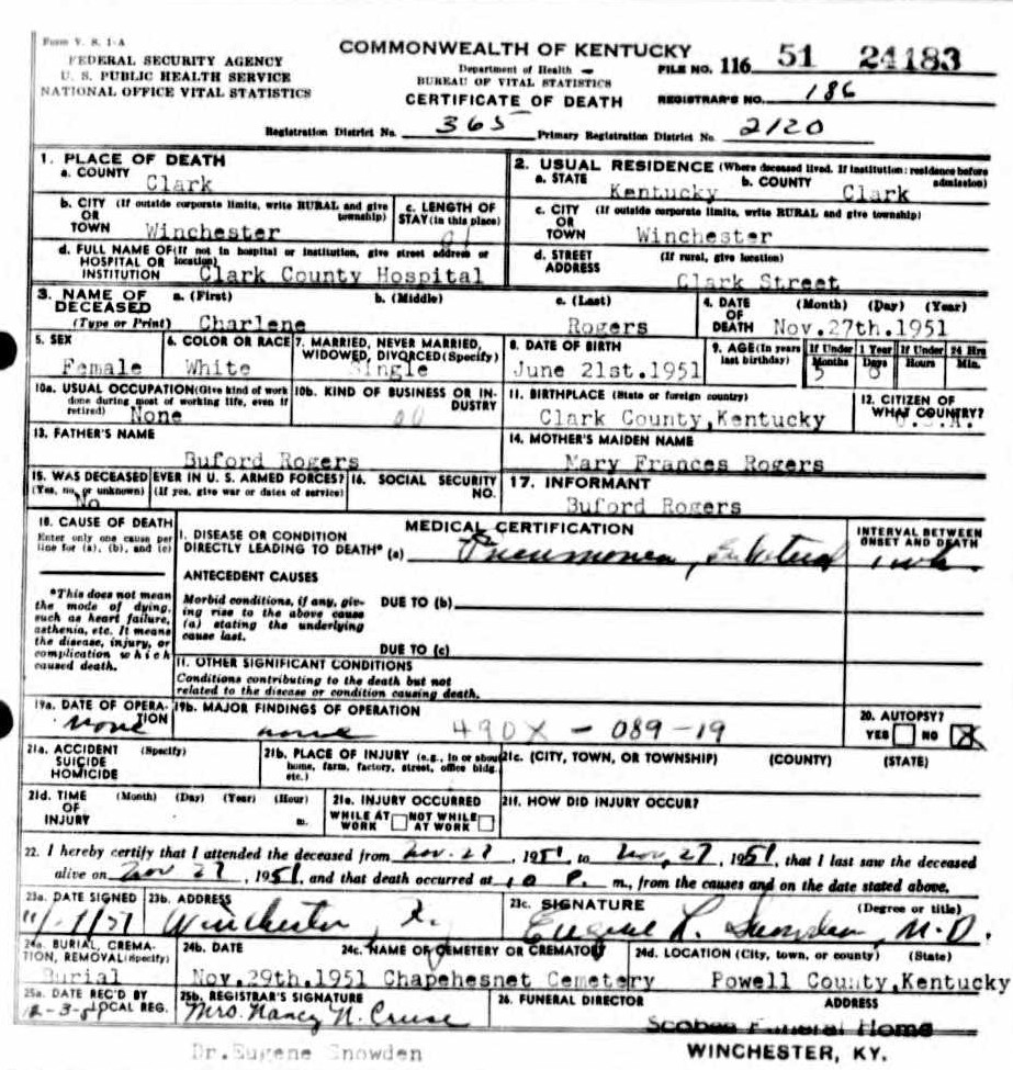 | Rogers | Charlene | June 21, 1951 | November 27, 1951 | Buford Rogers & Mary Francis Rogers | Clark County, Kentucky | Clark County, Kentucky |
