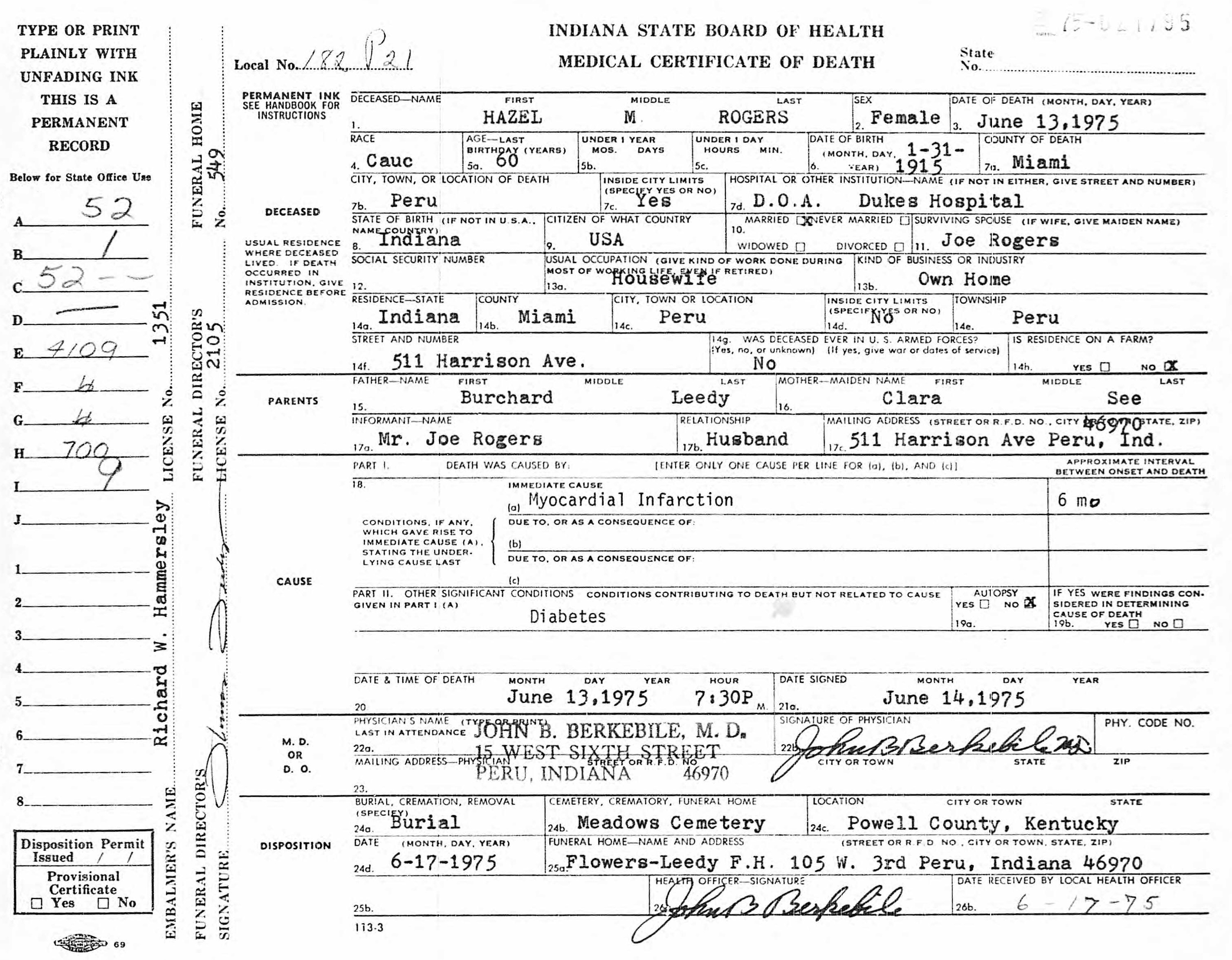 | Rogers | Hazel M | Leedy | January 31, 1915 | June 13, 1975 | Burchard Leedy & Clara See | Indiana | Miami County, Indiana |