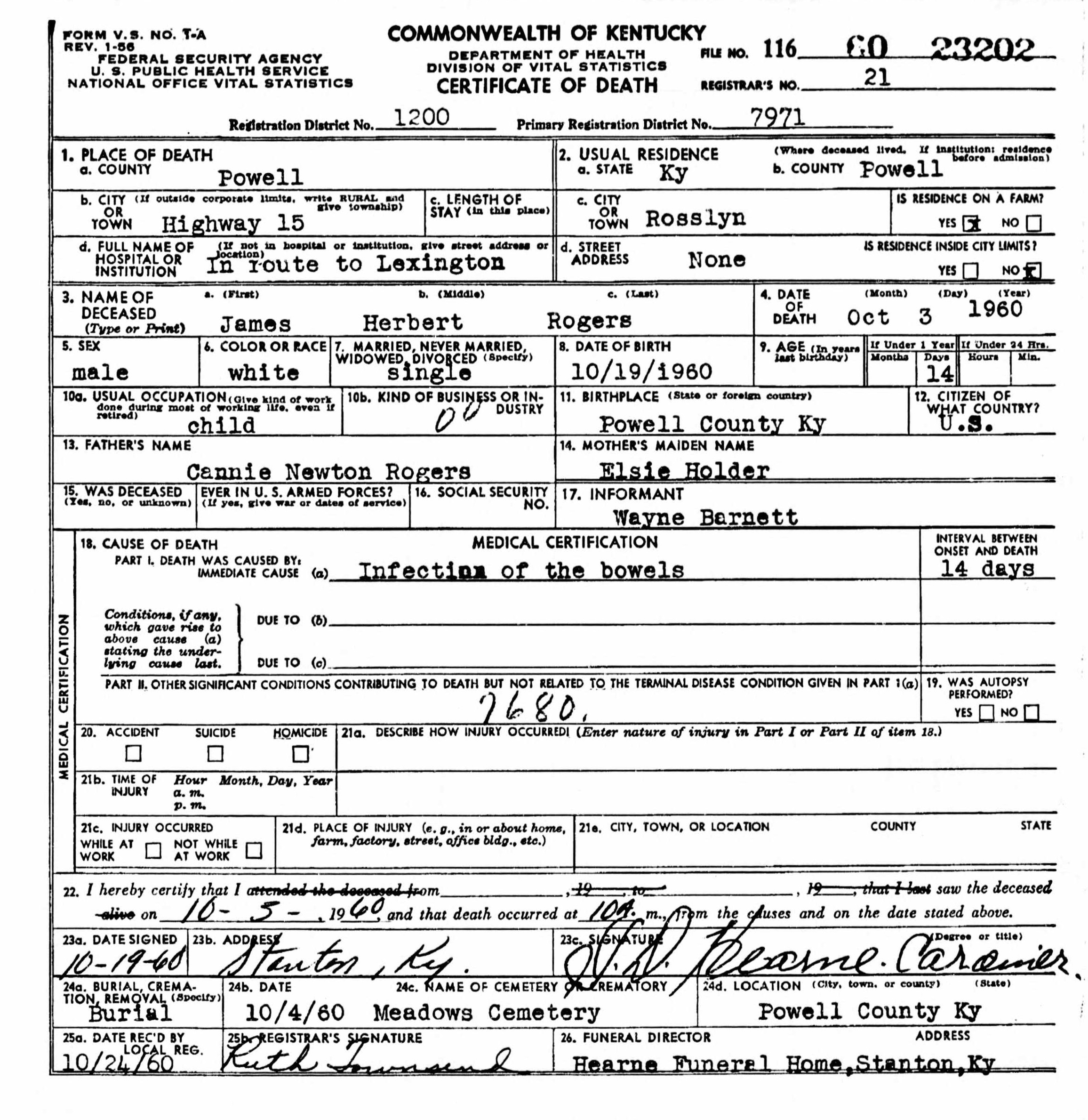 | Rogers | James Herbert | September 19, 1960 | October 3, 1960 | Cannie Newton Rogers & Elsie Holder | Powell County, Kentucky | Powell County, Kentucky |