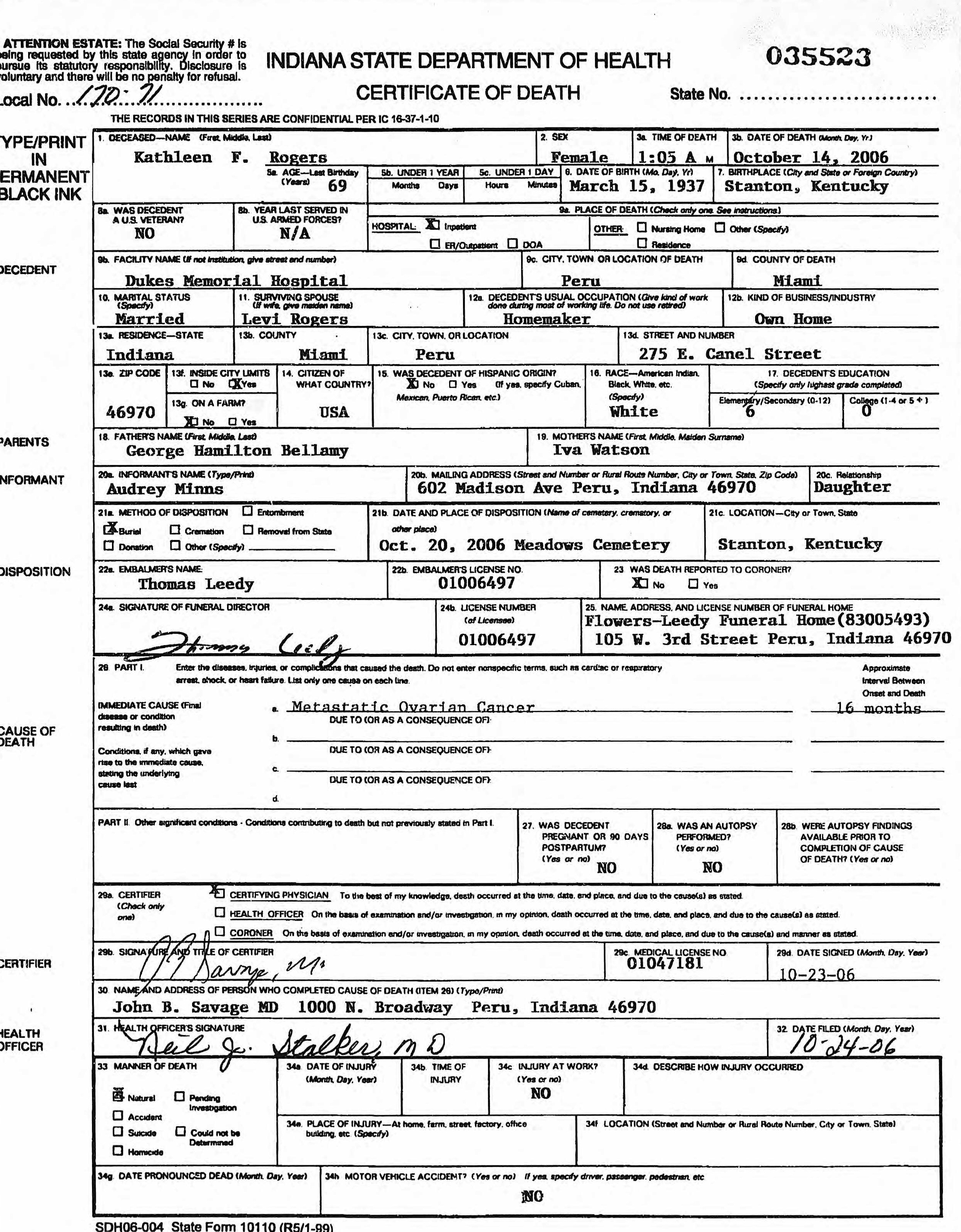 | Rogers | Kathleen F | Bellamy | March 15, 1937 | October 14, 2006 | George Hamilton Bellamy & Iva Watson | Powell County, Kentucky | Miami County, Indiana |