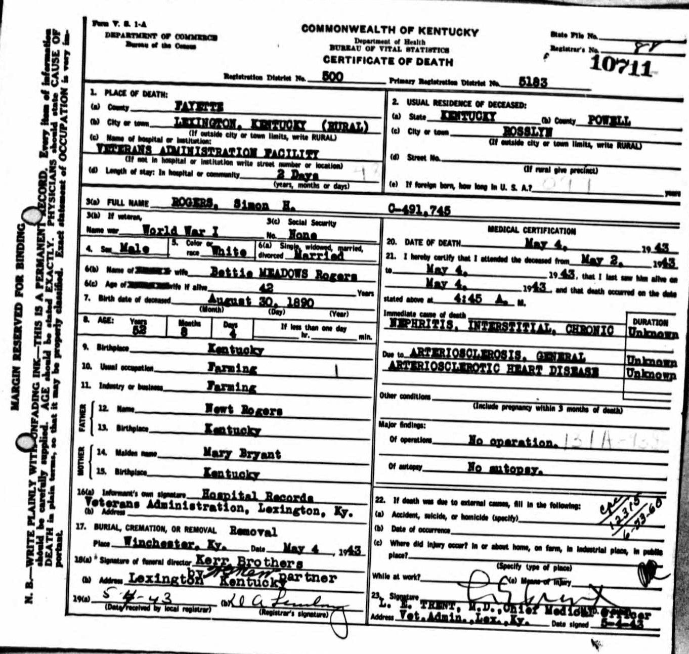 | Rogers | Henry N | March 4, 1924 | January 18, 1926 | Bettie Meadows | Powell County, Kentucky | Powell County, Kentucky | ||||