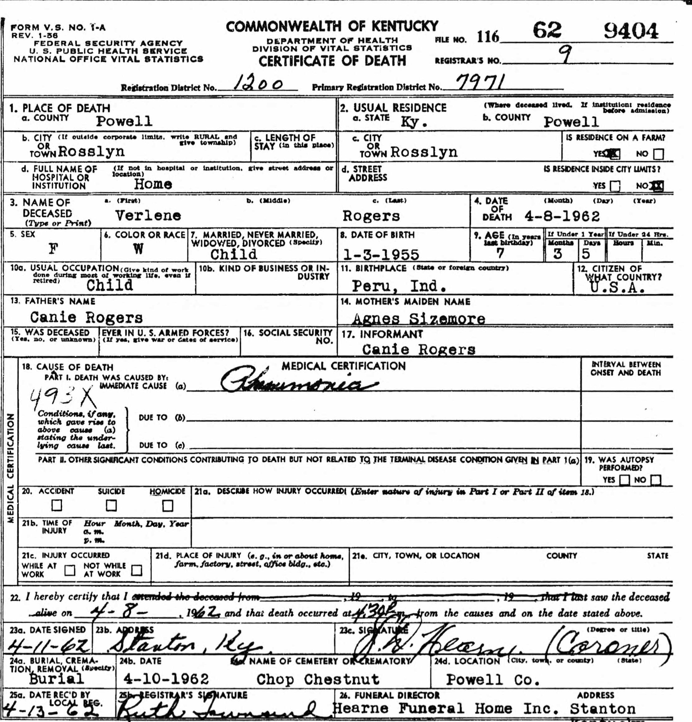 | Rogers | Verlene | January 3, 1955 | April 8, 1962 | Canie Rogers & Agnes Sizemore | Miami County, Indiana | Powell County, Kentucky |