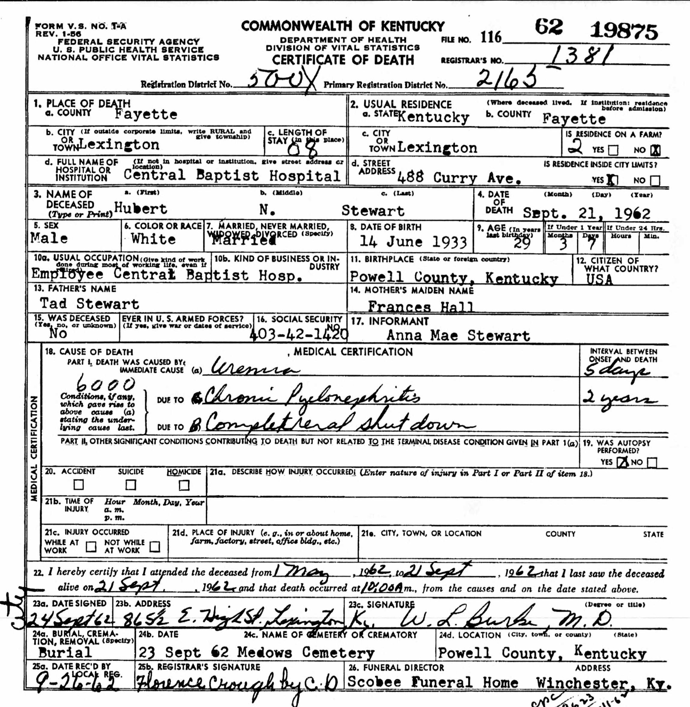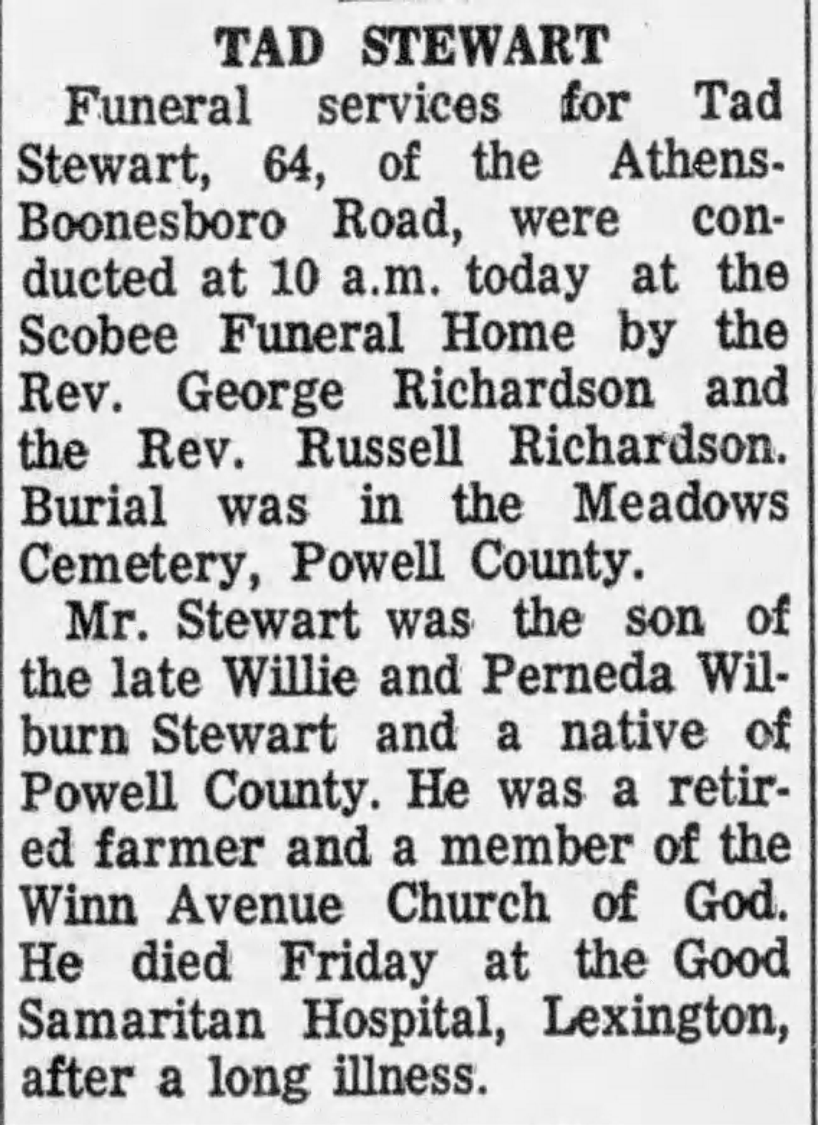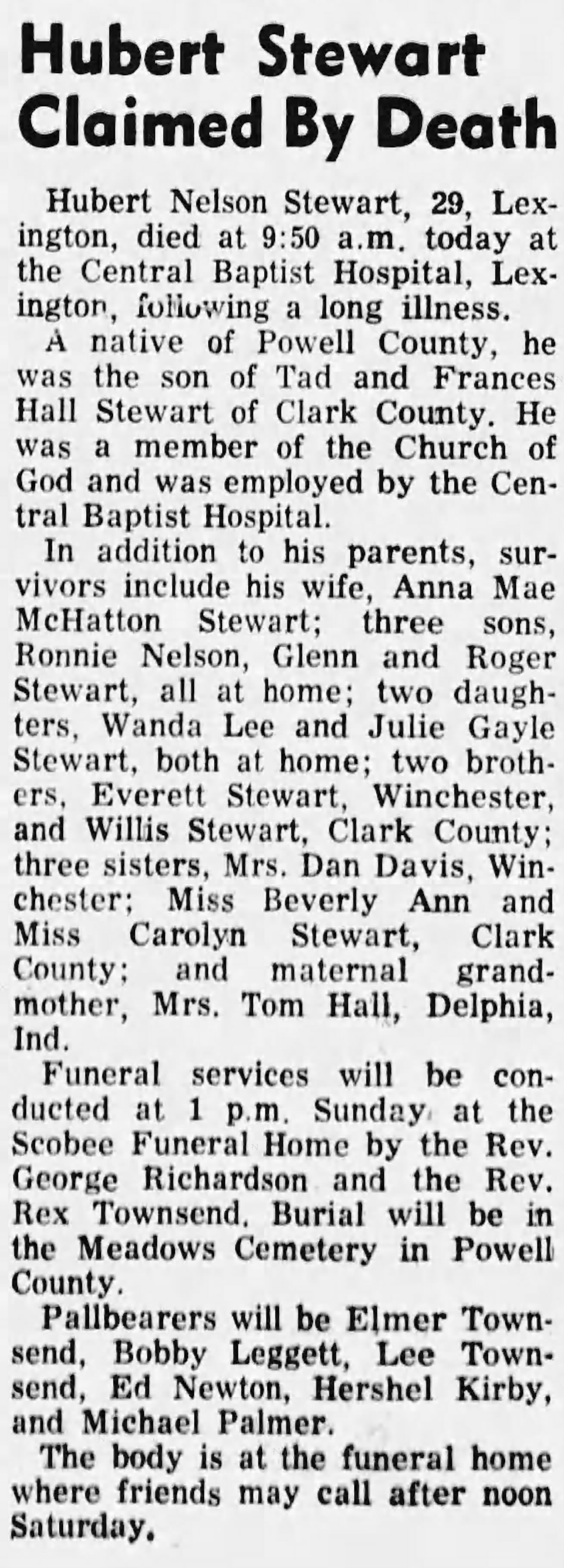 | Stewart | Hubert Nelson | June 14, 1933 | September 21, 1962 | Tad Stewart & Francis Hall | Powell County, Kentucky | Fayette County, Kentucky | The Winchester Sun | September 21, 1962 |