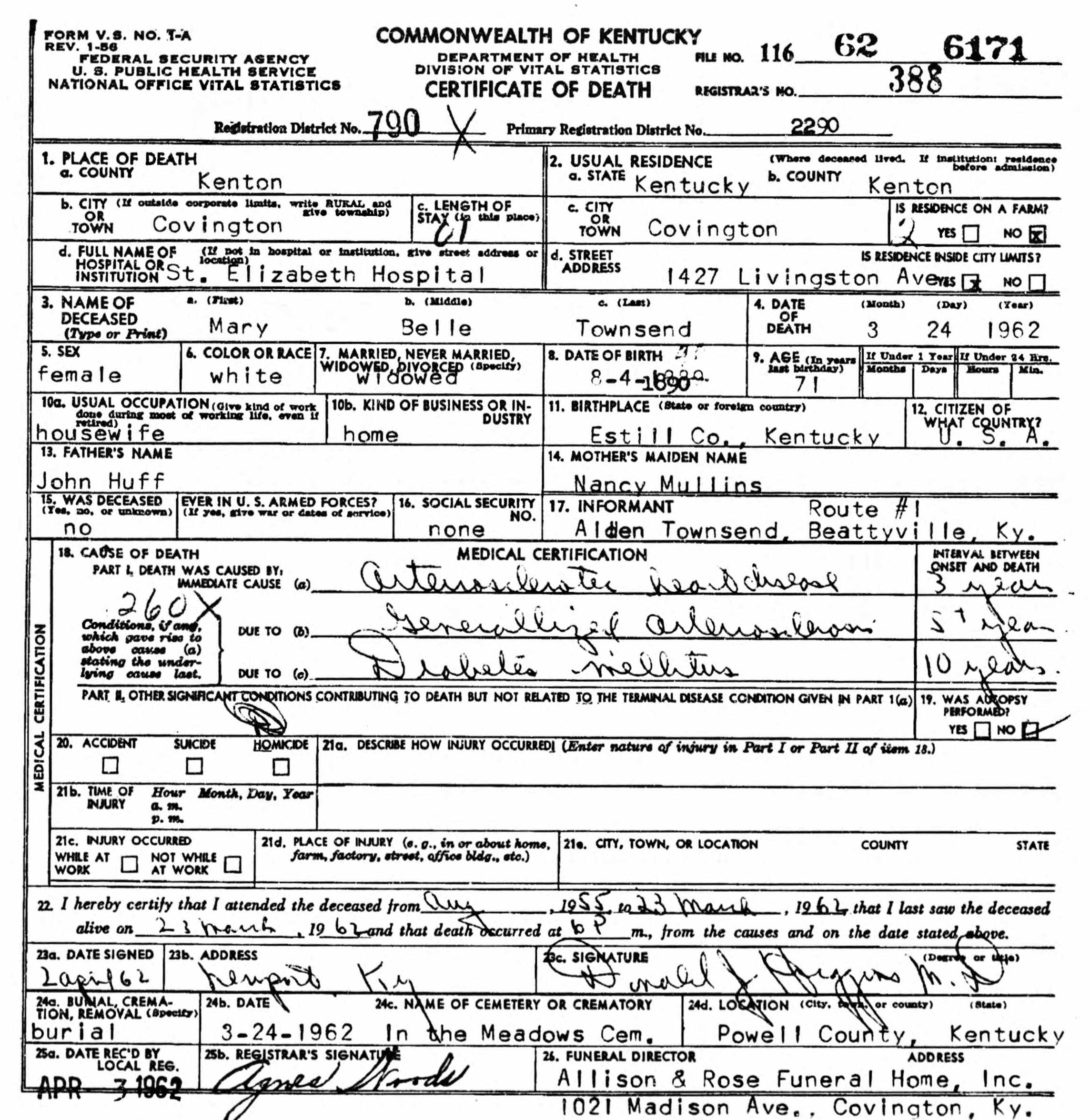 | Townsend | Mary Belle | Huff | August 4, 1890 | March 24, 1962 | John Huff & Nancy Mullins | Estill County, Kentucky | Kenton County, Kentucky |