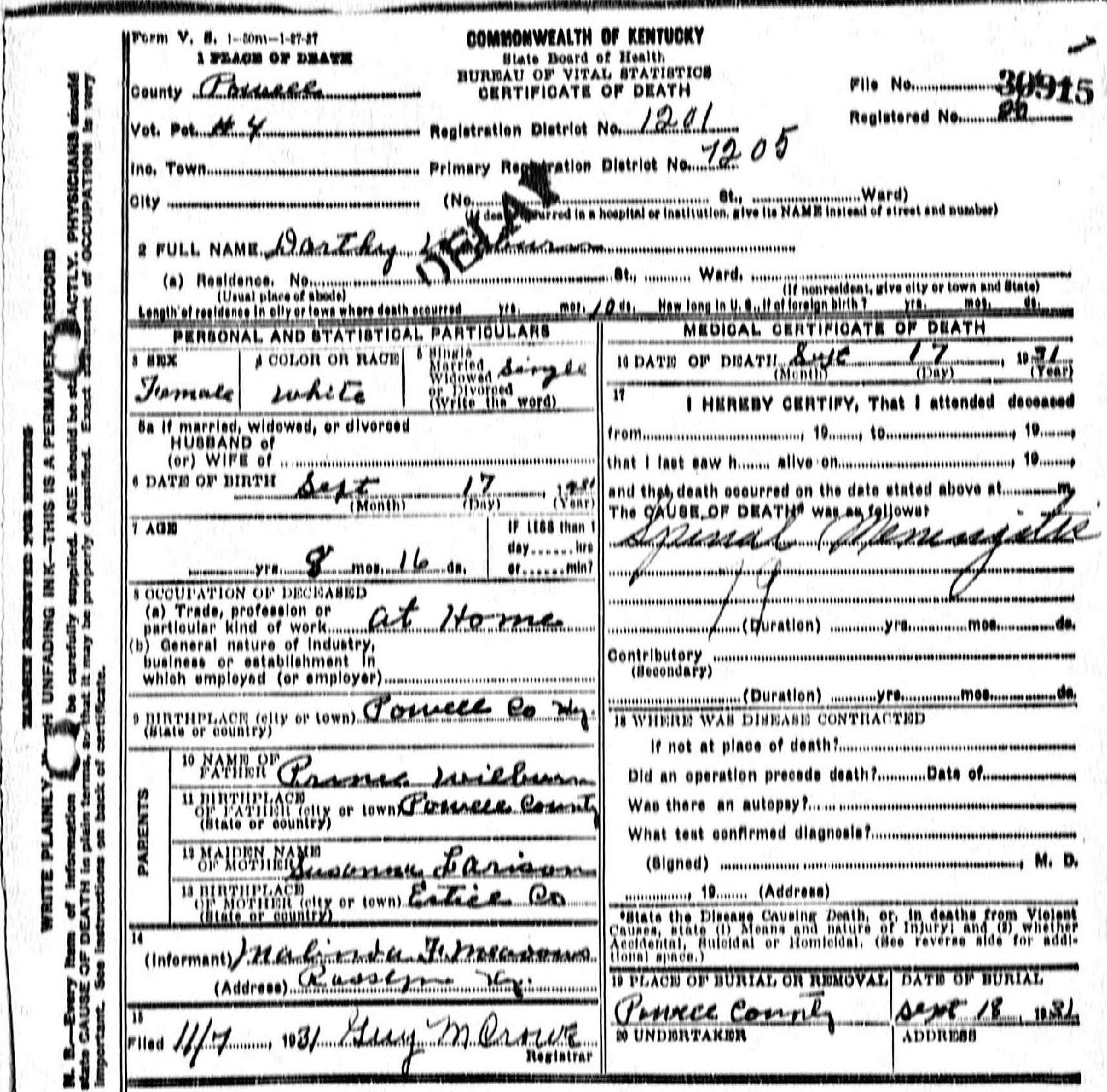 | Wilburn | Dorthy | September 17, 1931 | September 17, 1931 | Prince Wilburn & Susanna Larison | Powell County, Kentucky | Powell County, Kentucky |