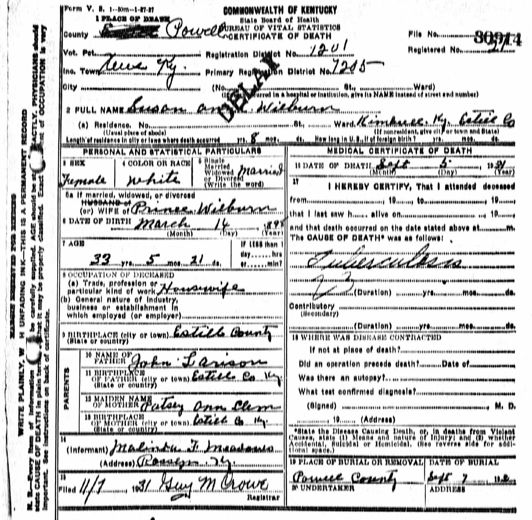 | Wilburn | Susan Anna | Larison | March 14, 1895 | September 5, 1931 | John Larison & Patsey Ann Clem | Estill County, Kentucky | Powell County, Kentucky |