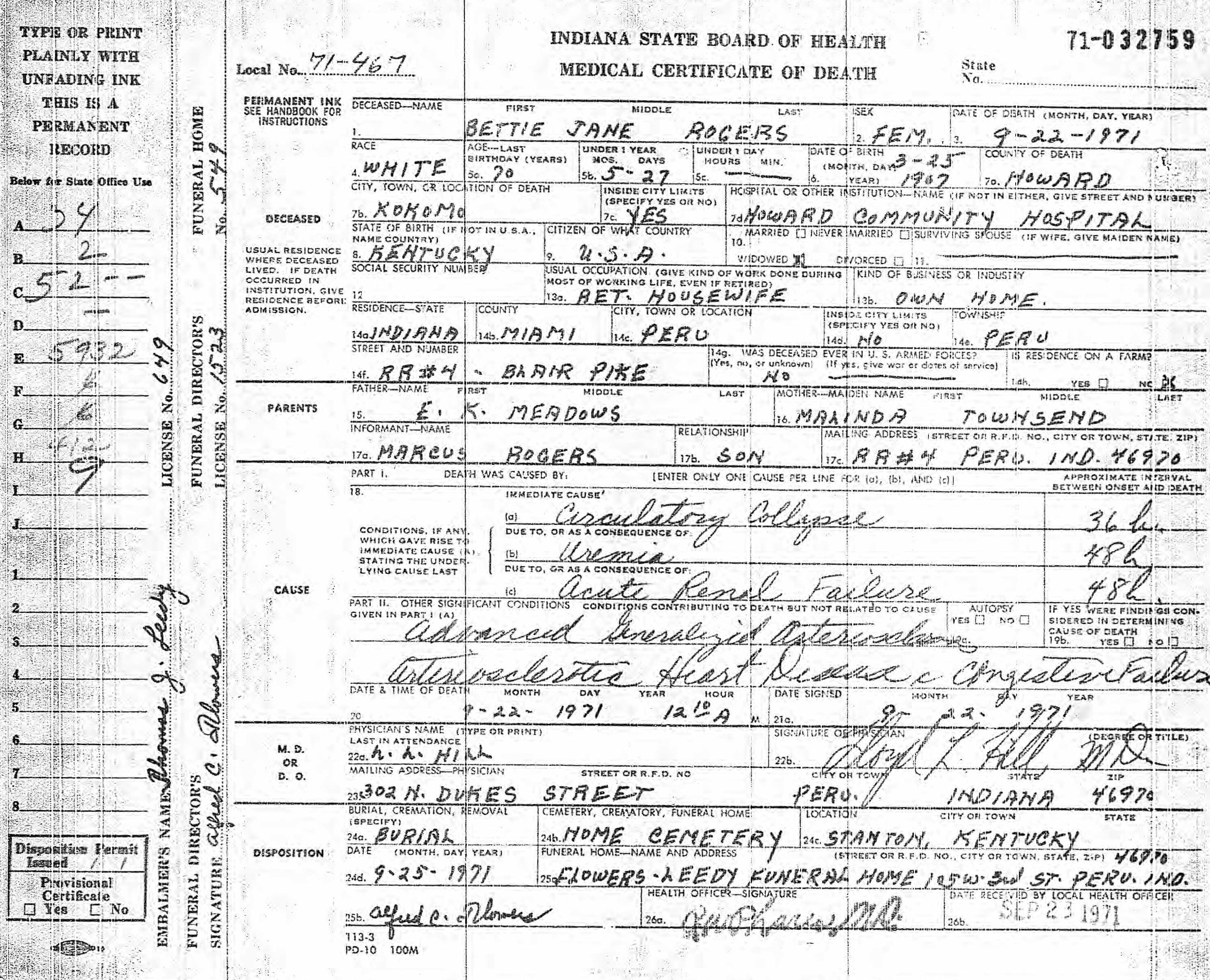 January 3, 1955 | January 27, 2016 | Canie Rogers & Agnes Sizemore | Miami County, Indiana | Miami County, Indiana |