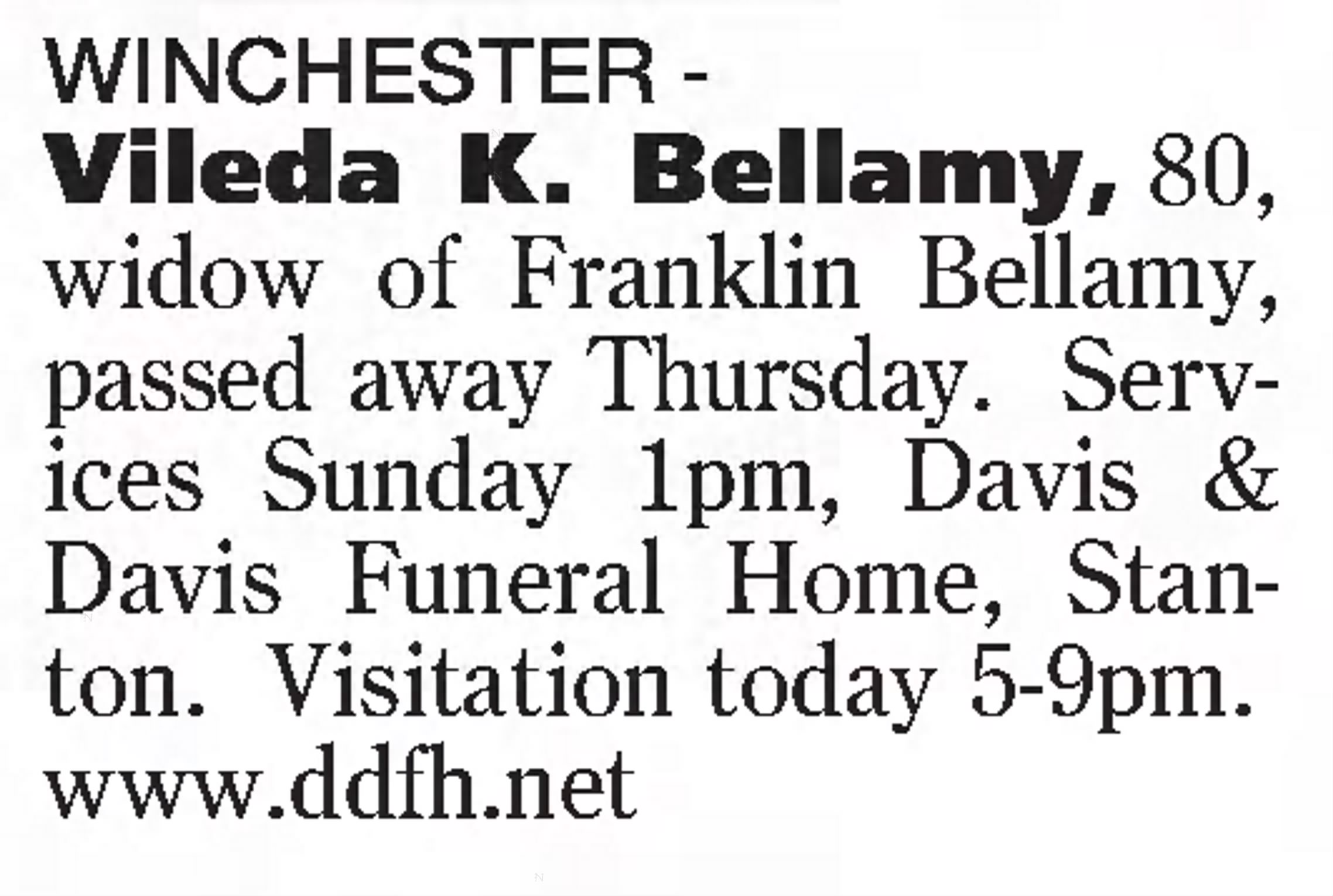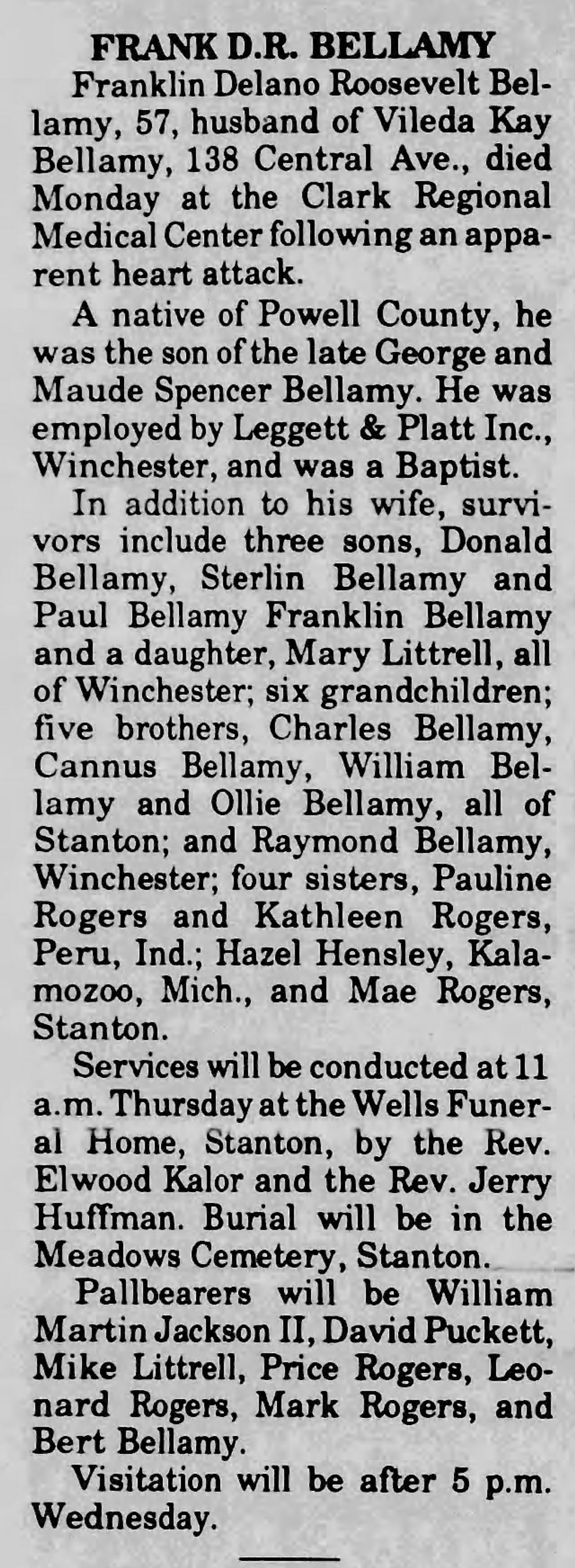 January 1, 1933 | December 17, 1990 | George Bellamy & Maude Spencer | Powell County, Kentucky | Clark County, Kentucky | The Winchester Sun | December 18, 1990 |