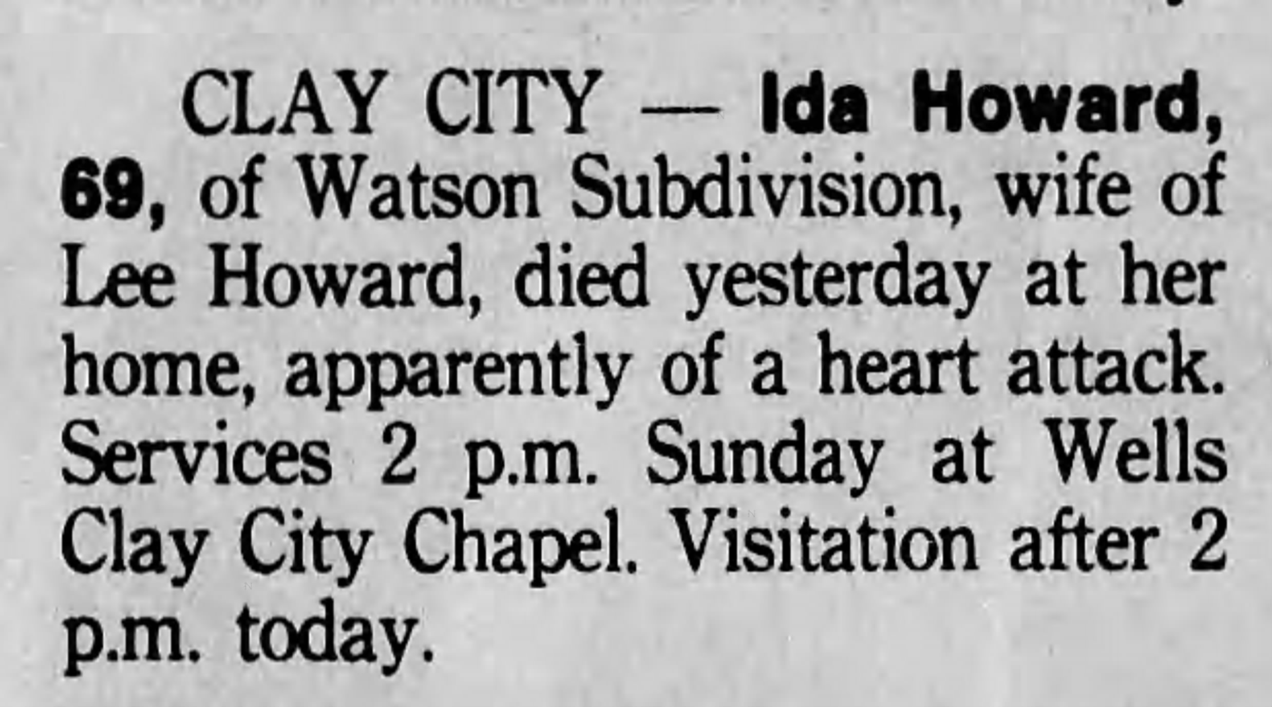 | Howard | Ida M | March 2, 1919 | August 26, 1988 | Breathitt County, Kentucky | Powell County, Kentucky | Lexington Herald Leader | August 27, 1988 |