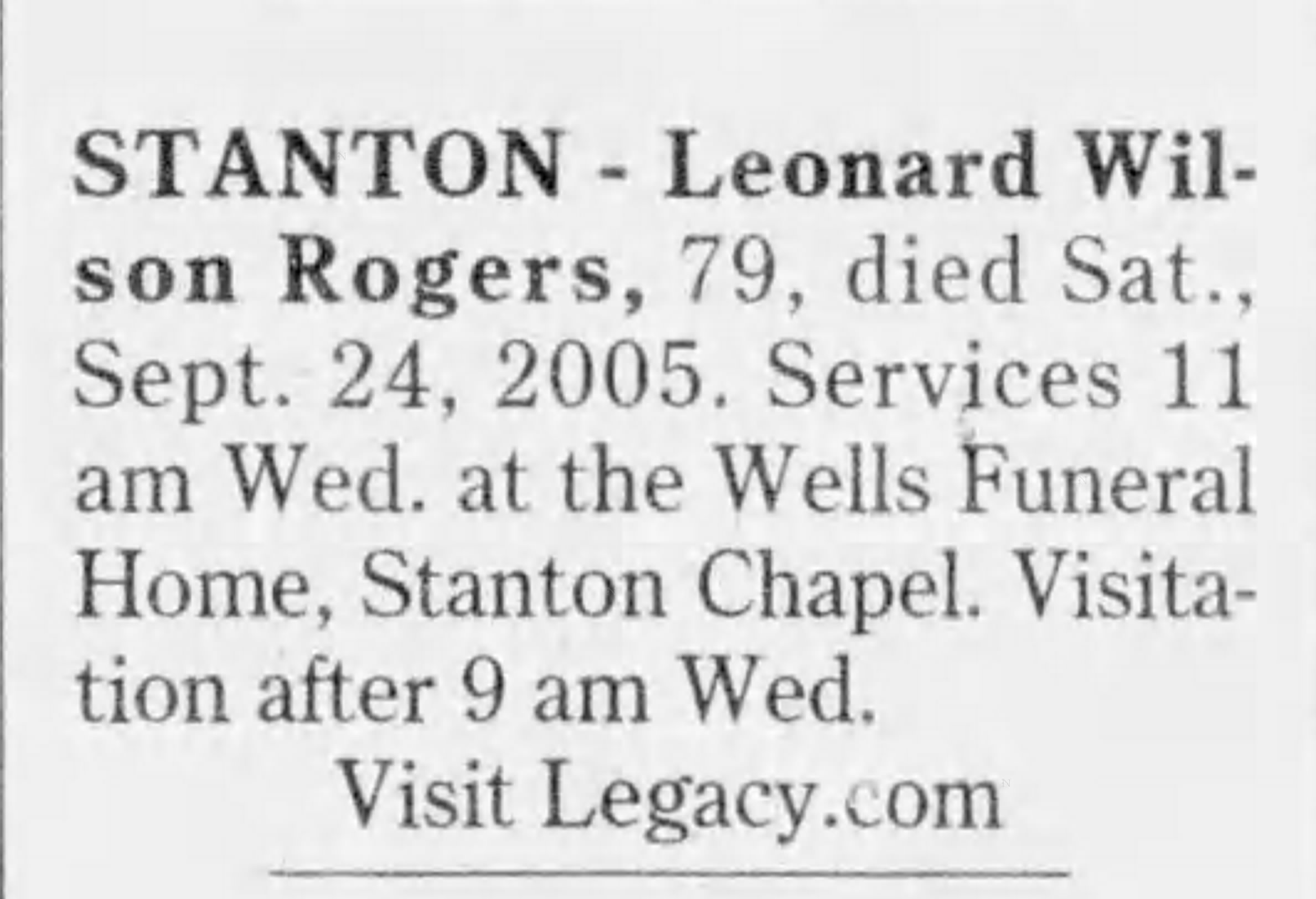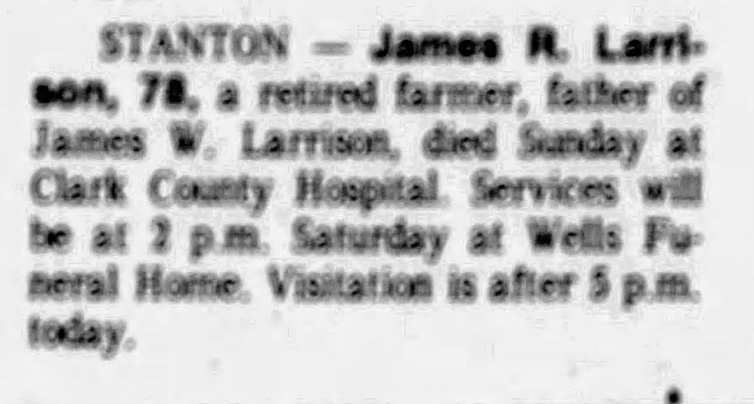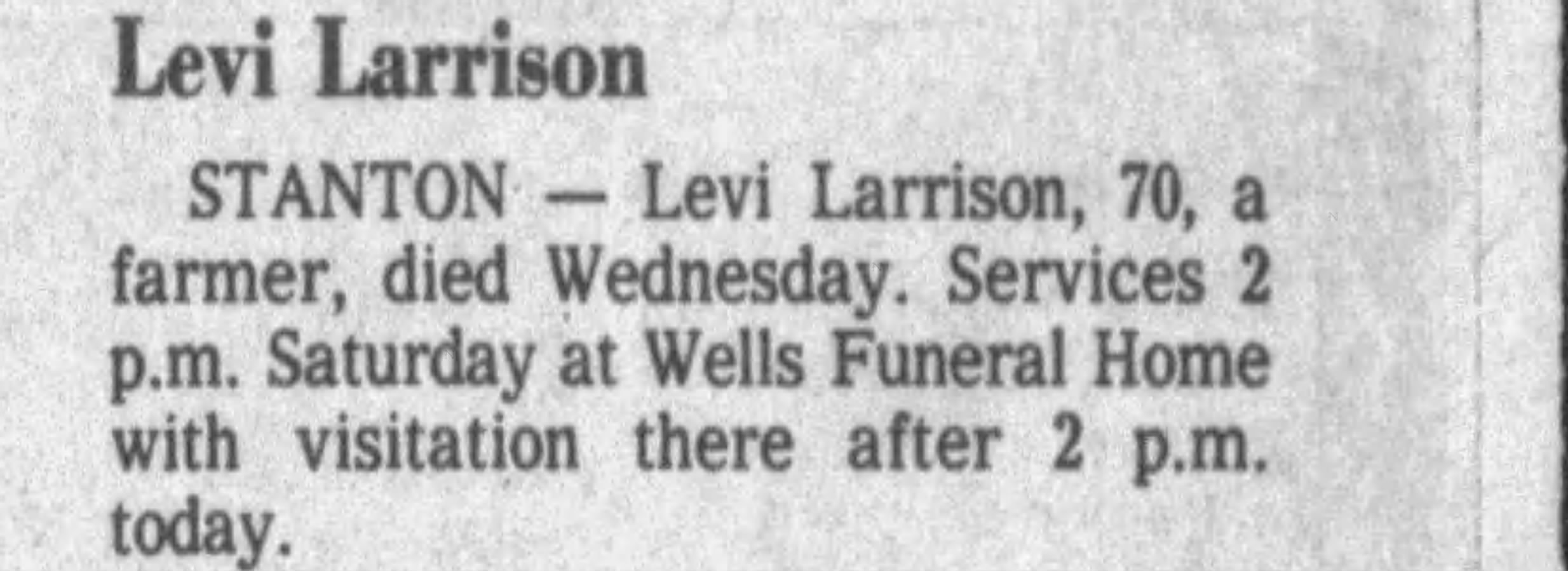 | Larrison | Levi | October 2, 1911 | August 12, 1981 | Fayette County, Kentucky | Lexington Herald Leader | August 14, 1981 |
