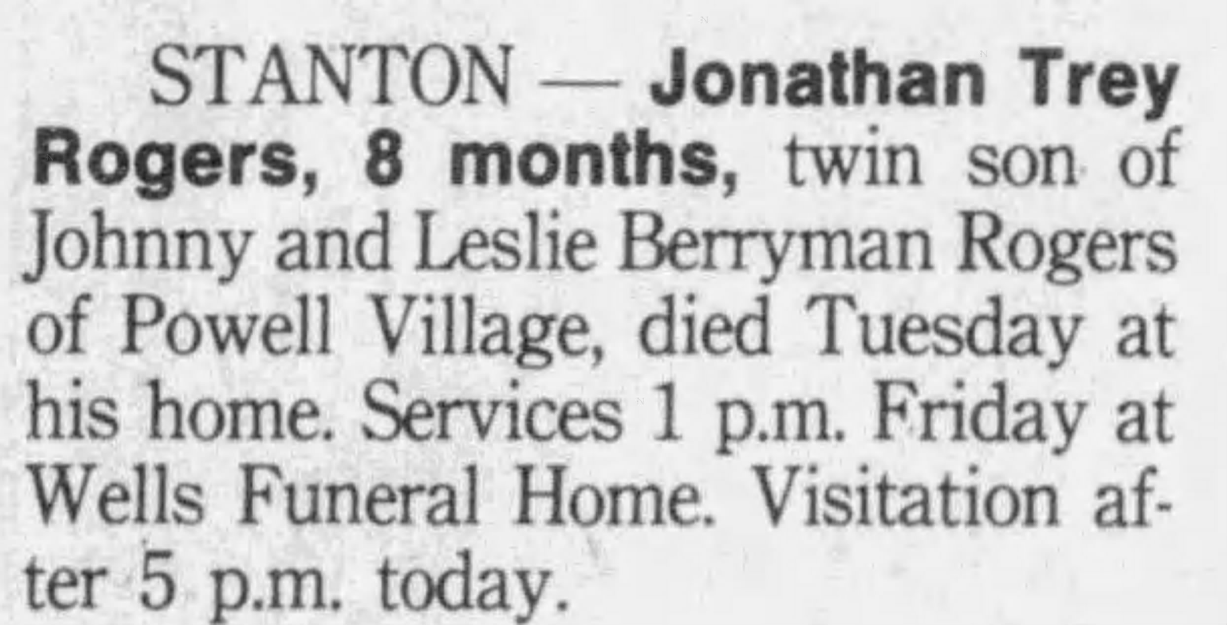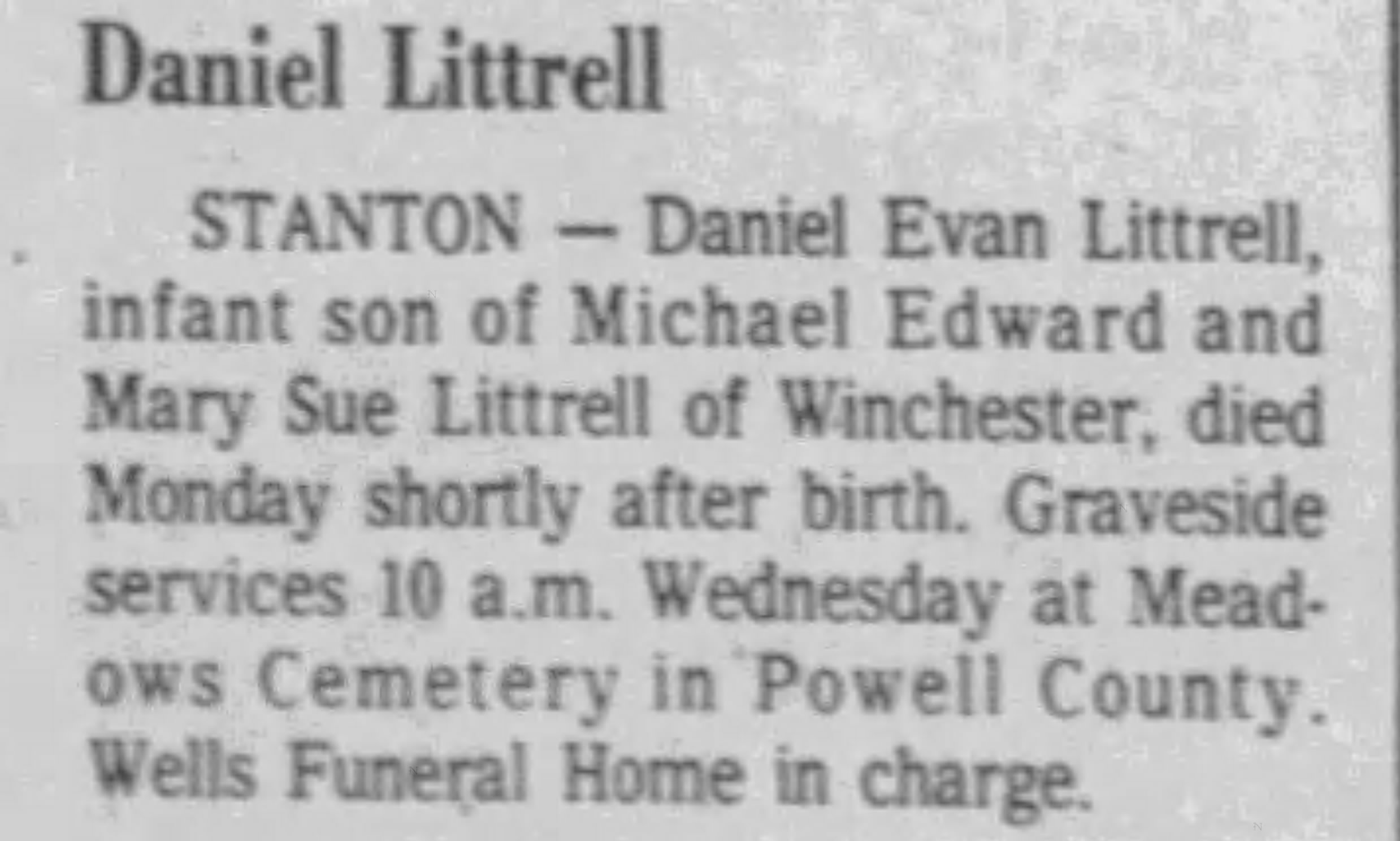 | Littrell | Daniel Evan | December 11, 1978 | December 11, 1978 | Michael Edward & Mary Sue Littrell | Clark County, Kentucky | Clark County, Kentucky | Lexington Herald Leader | December 12, 1978 |