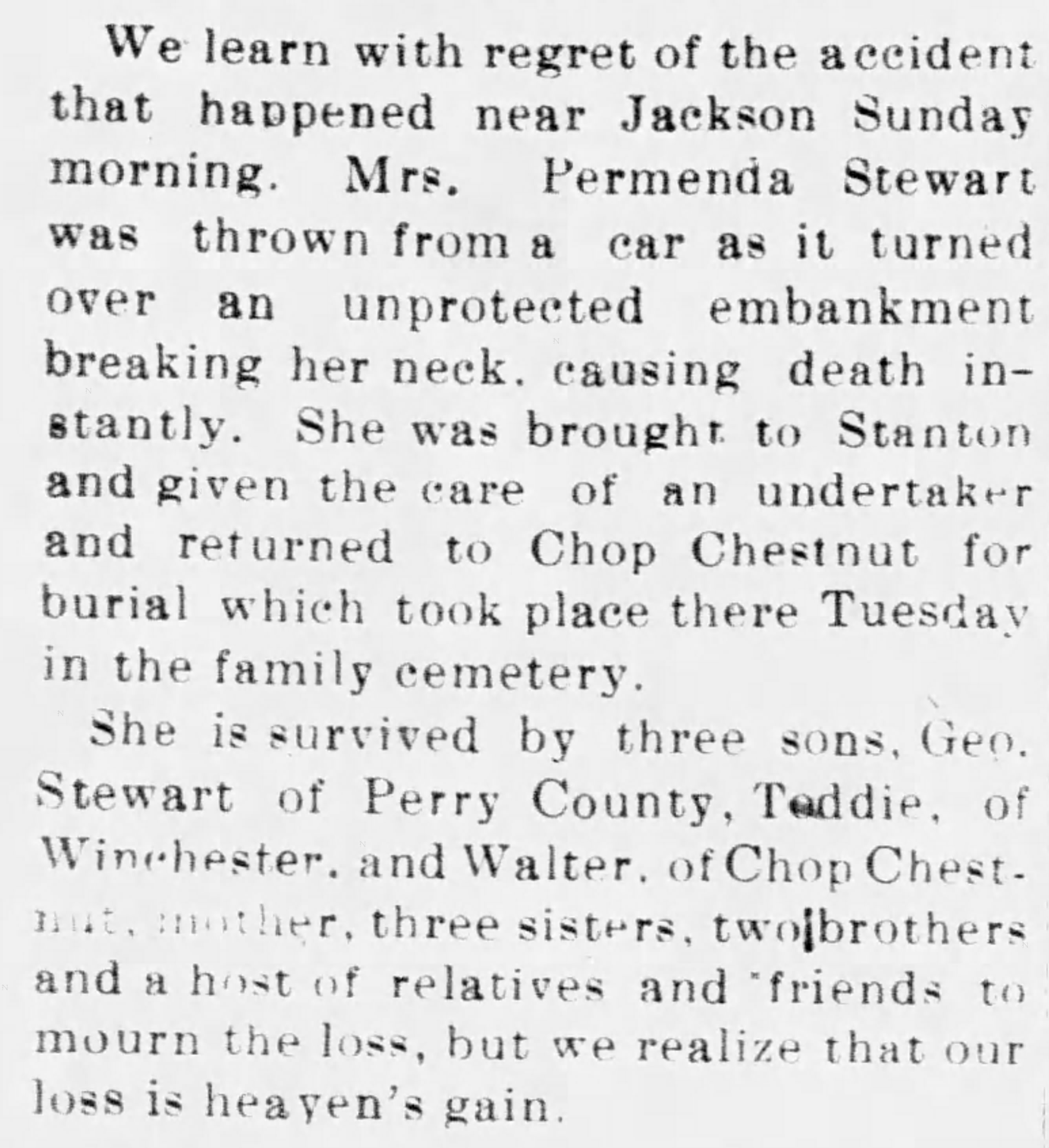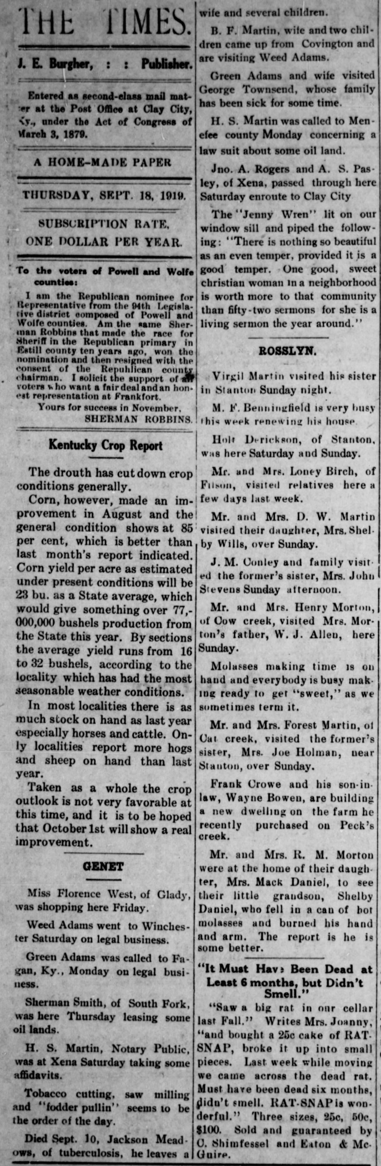 | Meadows | Jackson | September 10, 1919 | The Clay City Times | September 18, 1919 |