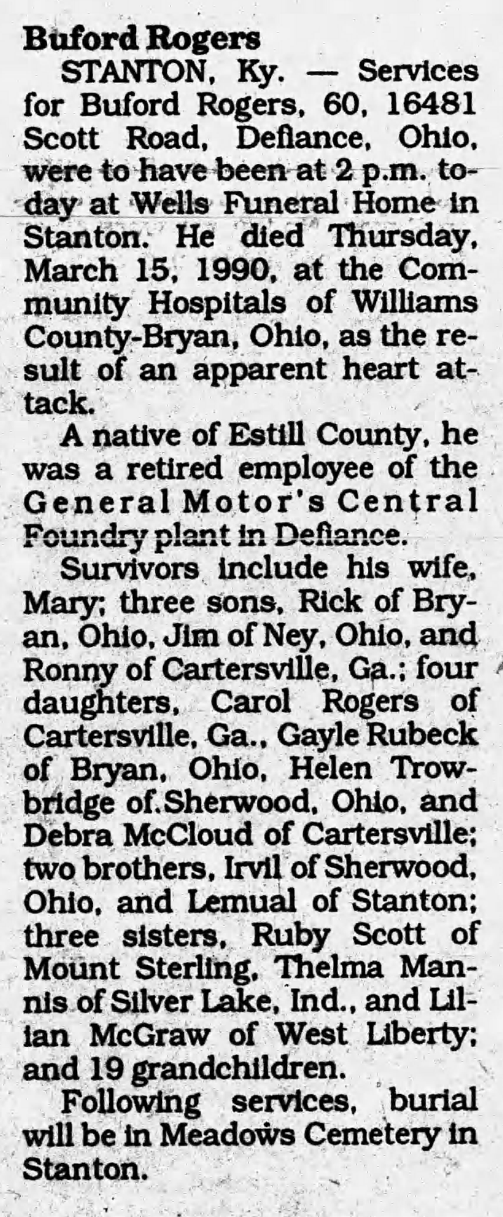 December 15, 1929 | March 15, 1990 | Bryan, Ohio | Bryan Times | March 19, 1990 |