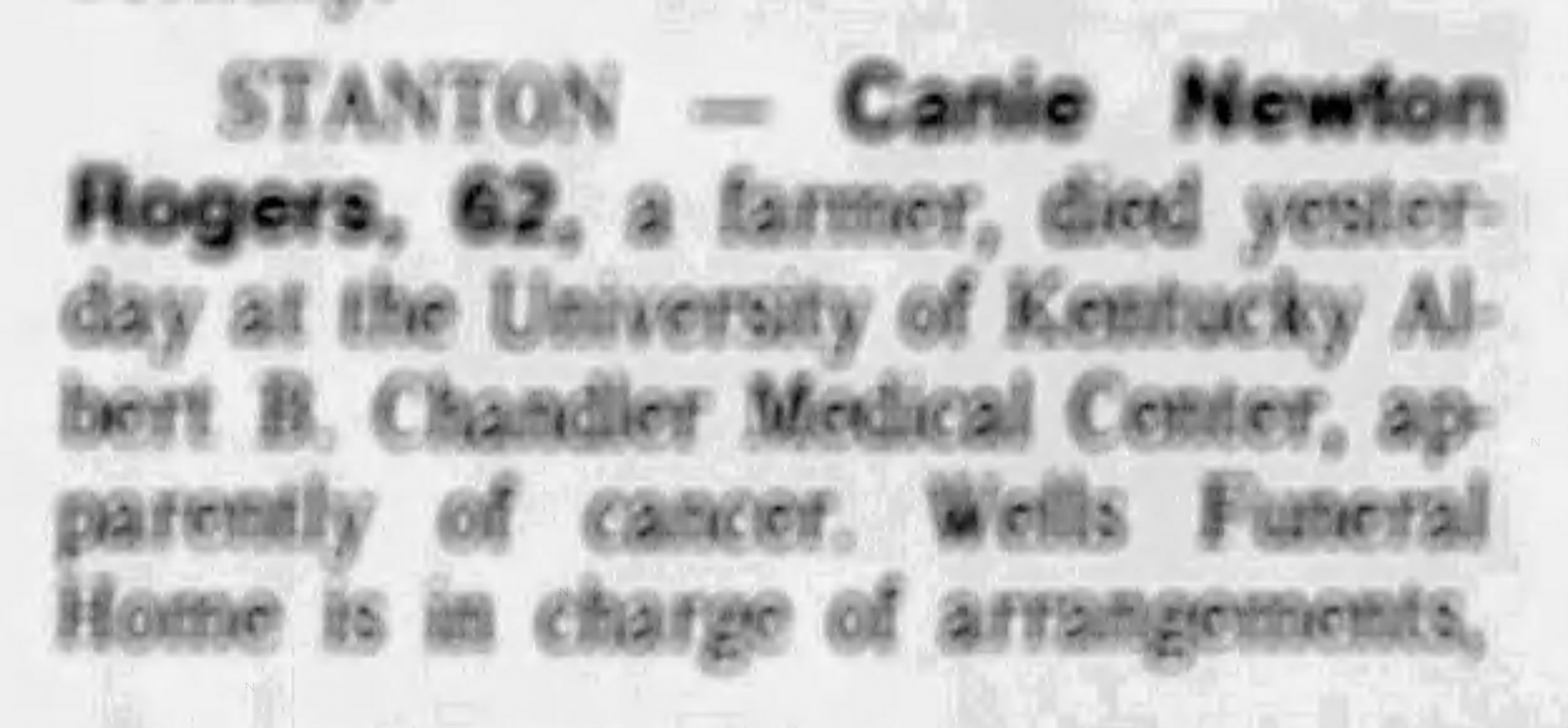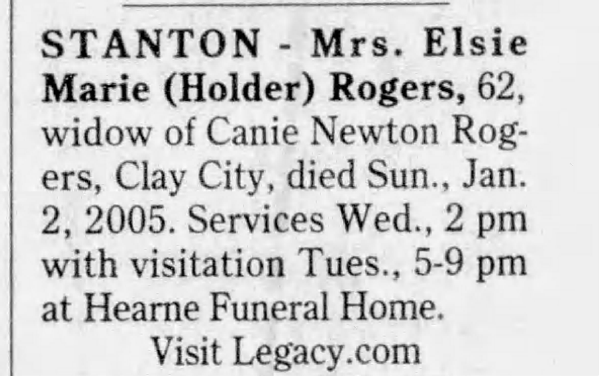 | Rogers | Elsie Marie | Holder | April 1, 1942 | January 2, 2005 | Nick Holder & Mandy Hatton | Powell County, Kentucky | Powell County, Kentucky | Lexington Herald Leader | January 3, 2005 |