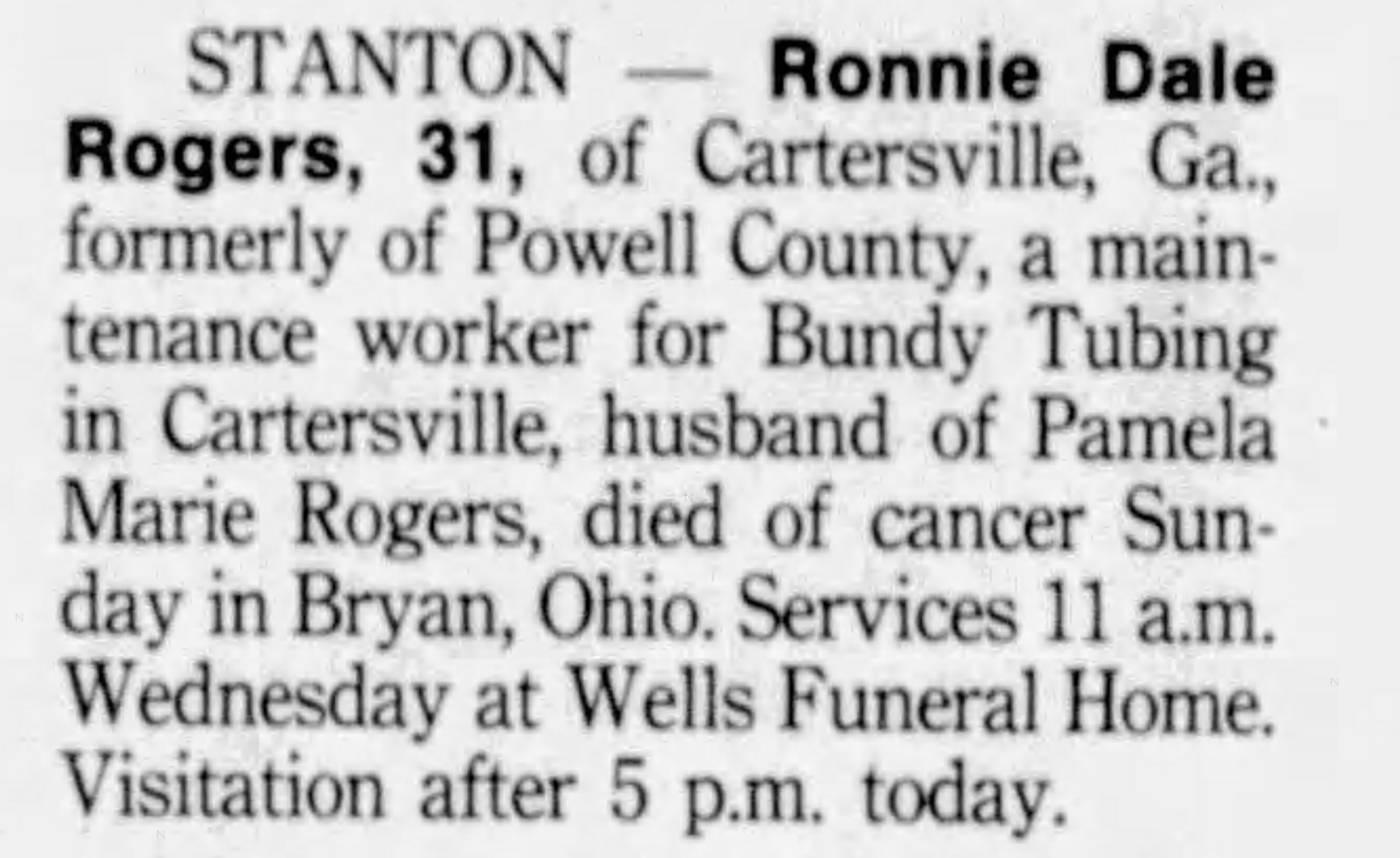 | Rogers | Ronnie Dale | June 2, 1991 | Bryan, Ohio | Lexington Herald Leader | June 4, 1991 |