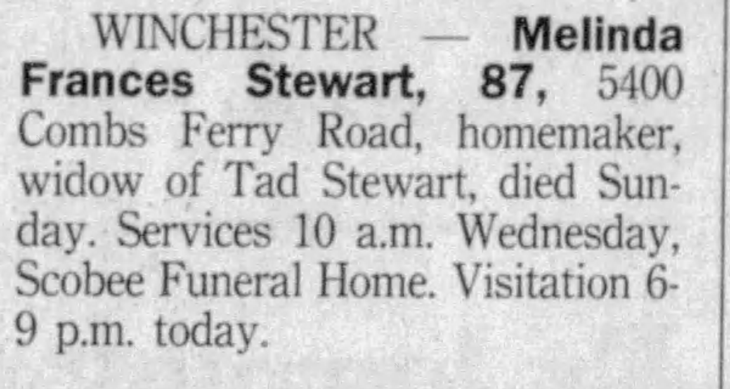Stewart | January 9, 1946 | January 5, 2020 | Tad Stewart & Malinda Frances Hall | Clark County, Kentucky | ||||